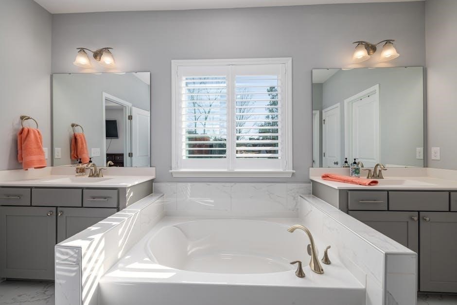 The PDF drawing should clearly illustrate the positioning of the sink‚ toilet‚ and shower/tub along the two walls‚ paying attention to clearances and traffic flow. Plumbing runs are slightly more complex than a single-wall setup‚ but still relatively manageable. This layout allows for a wider range of design options‚ including corner showers or larger vanities‚ making it a popular choice for many homeowners.
