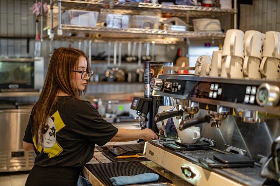 Regular cleaning ensures optimal performance and longevity. Descale every 3-6 months, wipe surfaces with a damp cloth, and rinse brew baskets after use to prevent residue buildup.